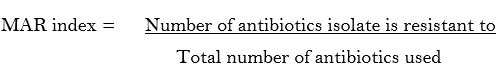 The following formula was used for the determination of Multiple Antibiotic Resistance (MAR) index for P. aeruginosa isolated in the study. The MAR was obtained by dividing the number of antibiotics the organism was resistant to by the total number of antibiotics used [13, 14].