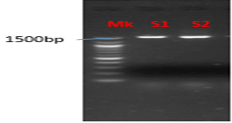 Figure 1. 1% Agarose gel depicting 1500bp fragment of 16S RNA of P. aeruginosa F23 and P. aeruginosa S15.