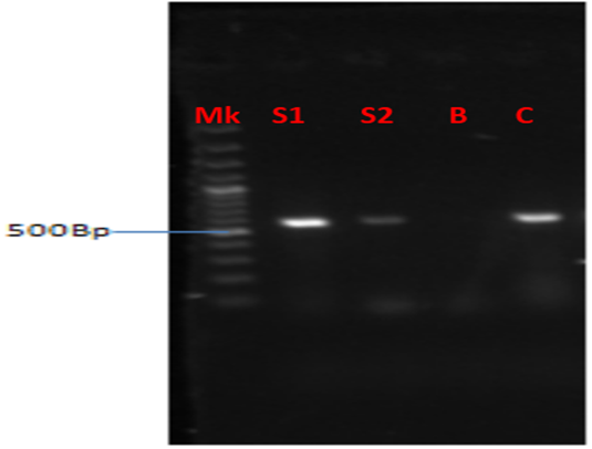 Pseudomonas aeruginosa F23 and Pseudomonas aeruginosa S15 isolates have been shown to possess both the plcH and bla PER genes with bands amplicons size of 307 bp Figure 1 and 520 bp Figure 1 respectively. Gel image indicates a positive amplification in the two samples. Figure 2 showed the gel image indicating a positive amplification with band size of approximately 520bp in all the samples. MK (100bp marker), S1 (F23), S2 (S15), B (buffer control), C (positive control) as indicated in Figure 2.