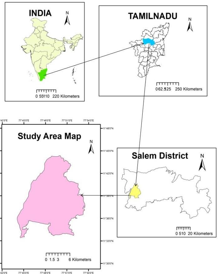 Edappadi Block is located at latitudes of 11°33’23” to 11°44'22” and longitudes of 77°44'4” and 77°53'31”. The Edappadi block has an average elevation of 288 m (945 ft.) in MSL and is located at the nearby basin of the hill known as 'Suriya malai' (Mountain of Sun). Sankari in the south, Jalakandapuram in the north, Konganapuram in the east, and Poolampatti in the west define the study area is shown in study area map Figure 1. The Cauvery River flows 8 kilometers west of the town from north to south, and the taluk covers an area of 324 square kilometers.