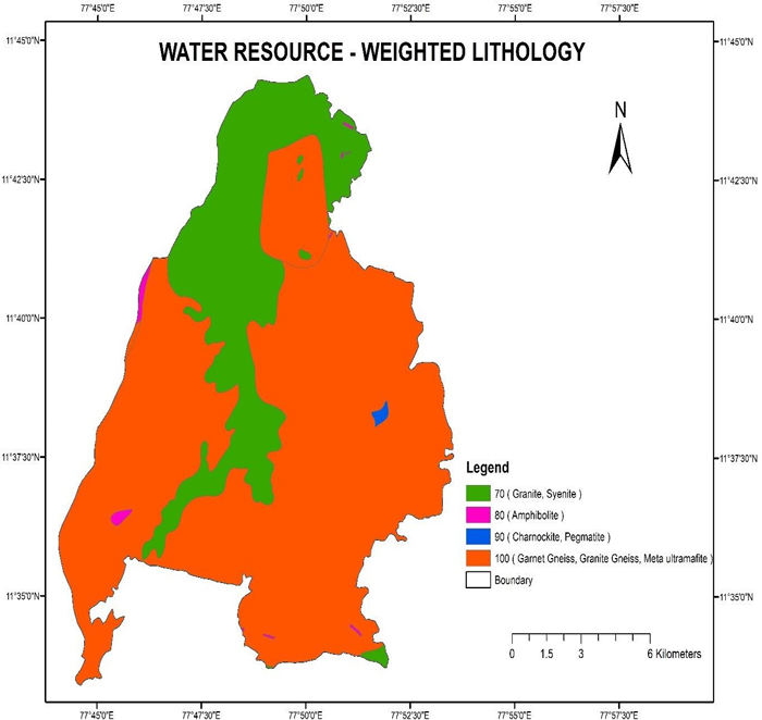 Secondary porosity is a key feature of crystalline aquifers, in which the reaction to shearing differs from rock to rock, affecting their water-holding ability. Amphibolite is given a higher score of 9 than Granite Gneiss based on highly foliated and weathered nature (Table 1). Charnockite, pegmatite, syenite, and granite are given 8 based on its secondary porosity. Similarly, rocks are graded based on their ability to carry water, and a weighted lithology GIS map is developed Figure 3.