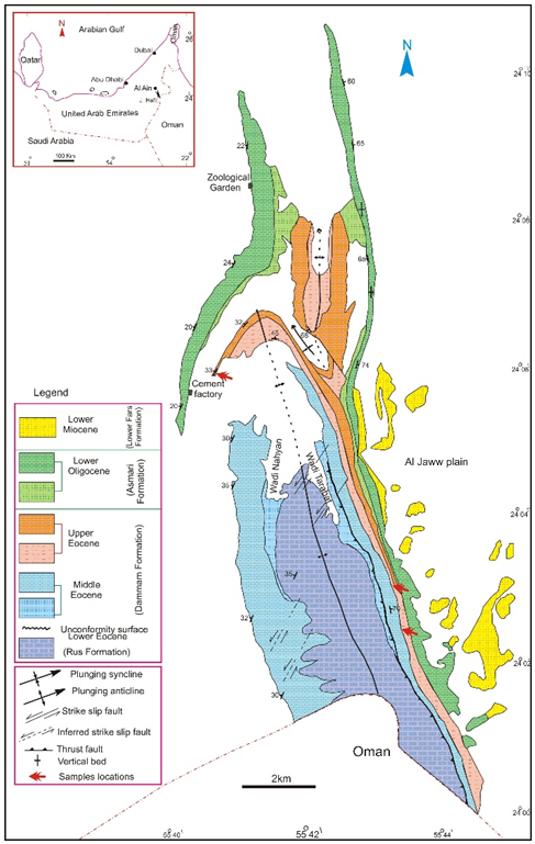 The study area lies close to Jabel Hafeet (Hafeet Mountain) which is about 29 km long, 5 km wide with maximum elevation about 1240 m above sea level and it lies on southeast of Al-Ain city which is situated in the eastern part of Abu Dhabi Emirate, UAE (Boukhary et al., 2002). The Hafeet Mountain is a huge double plunging with unique structural geology, highly asymmetric anticline that is developed over two large thrust fault underlying on its eastern and western limbs. It is classified into three main rock units that are composed of different types of carbonate rocks (Fig. 2). The oldest rock unit is the Rus Formation (Early Eocene 55-49 Myr) followed by Dammam Formation (Middle to Late Eocene 49-34 Myr) and then overlain by the third rock unit, which is the Asmari Formation (Early Oligocene 34-29 Myr) (Arman et al., 2013).