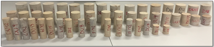 Three locations of limestone outcrops were selected to collect the representative rock block samples from Upper Dammam Formation, Jabel Hafeet Mountain (Fig. 2). In order to eliminate any anisotropic effects on the measurements, the rock block samples having no bedding planes were selected and collected (Fig 3). The rock block samples were brought to the laboratory and then core samples (49 core samples) were prepared (Fig. 3). After smoothing both sides of the core samples by trimming, the core samples with different diameters were labelled as UD1, UD1.5 and UD2 according to the core bit diameter, which are 25.4, 38.1 and 50.8 mm in diameter (Figs. 3 and 4). Before start testing, all core samples were weighted and their dimensions, diameter and length, were measured.
