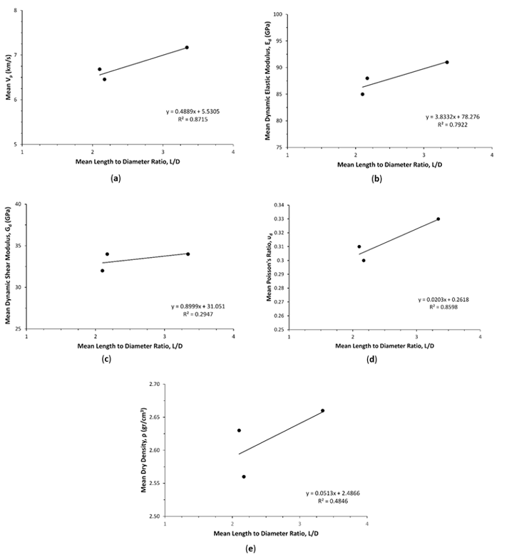 Figure 6a, b, c, d, e plot the mean length to diameter ratio, L/D against the mean Vp, the mean Ed, the mean Gd, the mean υd and the mean ρ for the samples. Fig. 6a, b and d show that there is a strong correlation between the mean length to diameter ratio, L/D and the mean Vp, the mean Ed, the mean υd. Fig. 6c, e demonstrates that there is a very weak to weak correlation between the mean length to diameter ratio, L/D and the mean Gd and the mean ρ.