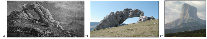 “Dragon” (La Pierre Percée, French “stone with a hole”) mountain Aiguille (aguille - French ‘peak, or needle”) in France. The relationship of these objects is represented in the engraving of 18th century (Fig. 1). Arch (44 ° 57 '54 "N, 5 ° 45' 33.01" E) has the size of the lumen of 3x5 m. According to one legend, it is a Dragon, absorbing the rays of the setting sun at the equinoxes. Mount Aiguille (45 ° 50'31 "N 05 ° 33'09" E) is the highest of erosional outliers of Vercors plateau (altitude - 2086 m above sea level, the excess over the bottom of the basin – about 1000 m, height of column - about 400 meters).Fig-1. La Pierre Percée on an engraving of the XVIII th century (A) and photography (B): Mount Aiguille (C)
