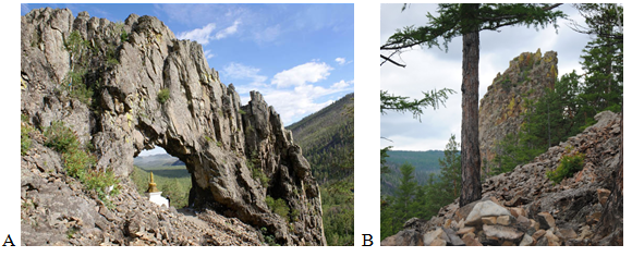 An example is the revered rock Temple Gate (Uuden Sume) in the national “Alkhanay” Park (UNESCO Heritage Site, established to protect the places of worship of the Buryat people, Russia). Rock Temple Gate is located at an altitude of 1100 meters, it has a radius of about 6 meters clearance, recognized as natural. Under its dome there is a suburgan - a small Buddhist stupa, and the place was still in the pre-Buddhist cult times (Fig. 4 A). A few hundred meters north of the arch there is one of the revered object of this park - Dorji-Paghman (Diamond Princess) - a rocky remnant height of 12 m (Fig. 4 B).
