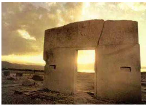 For example, the Gate of the Sun - (Inti Punku, Puerta del Sol), carved from a single block of gray-green andesite, are about 3 meters high, 4 meters wide and 0.5 m in thickness (Fig. 5). It is located in the temple of Kalasasaya, located near Lake Titicaca, on the plateau of the Altiplano (3825 m above sea level) in Bolivia. Archaeologist A. Poznanski called Kalasasaya a Temple of the Sun and the main construction of the Tiwanaku civilization. He proved that it is a solar observatory and a stone calendar that corresponds to the astronomical situation of 15,000 years BC. The frequent archaeological remains of animals, extinct 12,000 years BC, confirmed this dating. The monumentality of the complex as a whole suggests that in ancient times the city was the center - performing metropolitan functions in the territorial system of the region.