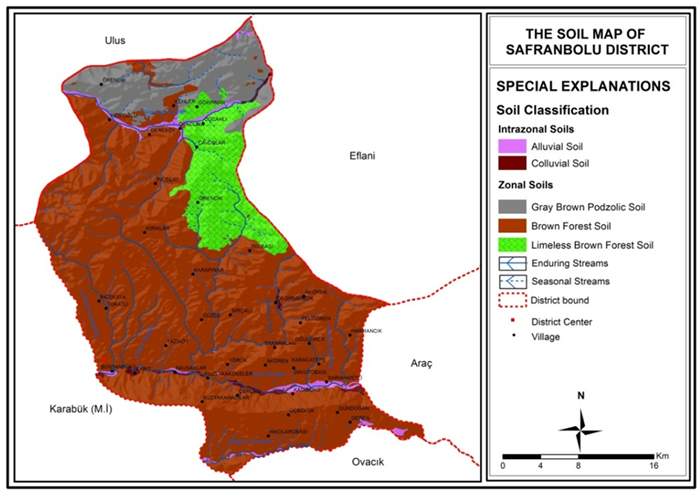 In the light of these experiences and studies, the elevation range for Saffron cultivation has been determined as 0-1300 meters. According to the same evaluation results, the precipitation demand of Saffron requires values over 300 mm. The inclination of the area must be between 0-15%. The areas that are suitable for Saffron cultivation are explained in the table above.Map-2. The Soil Map of Safranbolu District