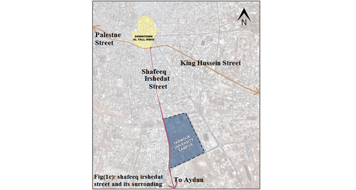 Shafeeq Irshedat street is located on the west side of Al-Yarmouk University, Originates from the north at (Boor Saeed) circle, which is the intersection point of king Hussein street with Palestine street, and directed to the south until Aydun area. (figure1 a,b,c)