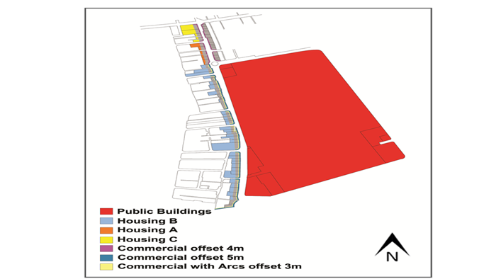 It has been noticed after the field survey, that the studied land plots on the university street which were categorized as residential plots and having a commercial strip in the front according to the municipality land use map, in actuality they are completely occupied by commercial uses in the ground floor, in addition that all those buildings are incompatible with the setbacks regulations as assigned from the municipality (figure6).