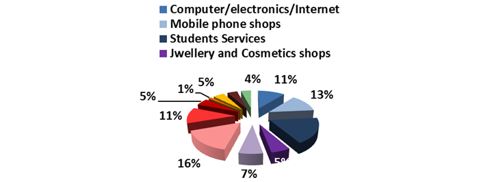 Restaurants and coffee shops in the university street also founded with a high percentage counting 16%, after the interview which was held with restaurant and coffee shop owners, it was concluded that students shapes the main costumers for these shops , because there proximity to the university campus also students which accommodate in the university district purchase from them.