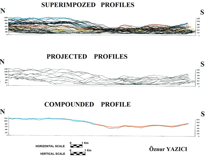 ‘Relation Method Between Slopes and Contour Lines’ developed by Prof. Dr. Erol (1993 ) was used in the determination and aging of the erosion surfaces. This method is based on the principle of showing flats and slopes on morphometry map prepared by using topography maps. Correlations were made between the extracted profiles of the study area; the ones that match each other are grouped among themselves and dated from the old to the young (Figures 3 and 4). Each elevation stage is symbolized with a different color and the morphometry map is aged with overlapping profiles. When this aging is carried out, the types, characteristics and ages of the geological formations consisting of the surface are taken into consideration. Finally, the map prepared for called as ‘Map of Erosion Surfaces’ (Figure 5).