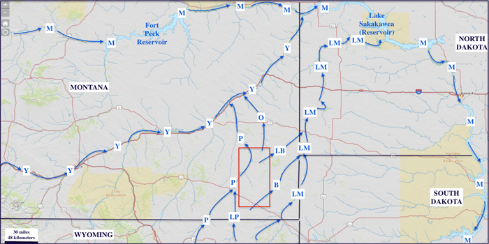 Figure-1. Map showing the study region (red rectangle) location near the Montana southeast corner. Blue arrows emphasize drainage routes discussed in the text and flow directions. Blue letters identify those drainage routes as follows: “B” Boxelder Creek, “LB” Little Beaver Creek, “LM” Little Missouri River, “LP” Little Powder River, “M” Missouri River, “O” O’Fallon Creek, “P” Powder River, and “Y” Yellowstone River.