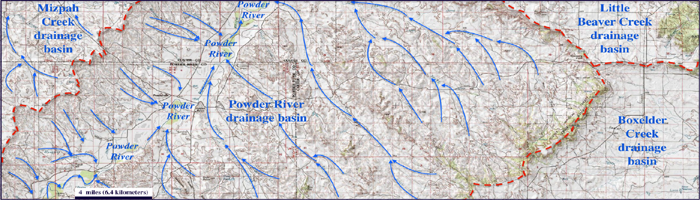 Figure-3. Topographic map showing the Powder River valley and includes areas seen in figures 2 and 4. Blue arrows emphasize drainage routes and directions and dashed red lines show major drainage divides. Mizpah Creek is a north-oriented tributary joining the north-northwest oriented Powder River to the northwest of figure 3. The contour interval is 20 meters (66 feet).