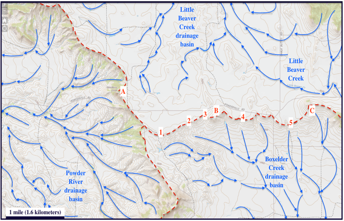 Figure-4. Topographic map showing the Little Beaver Creek-Boxelder Creek-Powder River divides located to the south of figure 2. Blue arrows emphasize drainage routes and directions and dashed red lines show drainage divides. The contour interval is 20 feet (6 meters).