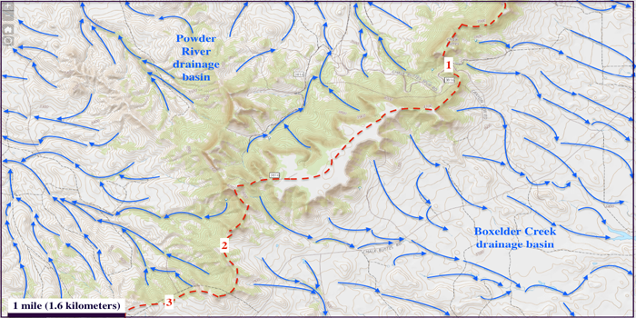 Figure-5. Topographic map showing the Chalk Buttes area to the southwest of figure 4. Blue arrows emphasize drainage routes and directions and the dashed red line shows the Powder River-Boxelder Creek drainage divide location. Red numbers identify locations discussed in the text. The contour interval is 20 feet (6 meters).