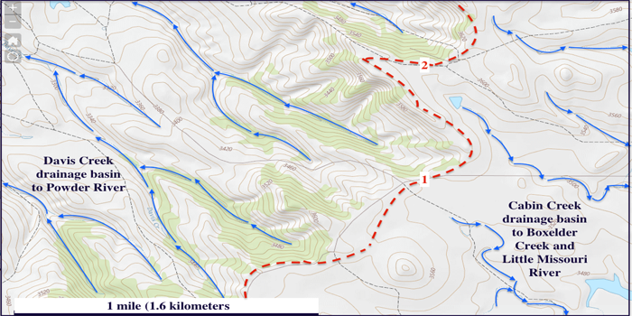 Figure-6. Topographic map showing the Davis Creek-Cabin Creek drainage divide area to the southwest of figure 4. Blue arrows emphasize drainage routes and directions. The dashed red line shows the Powder River-Little Missouri River (Davis-Cabin Creek) drainage divide and the red numbers refer to locations discussed in the text. The contour interval is 20 feet (6 meters).
