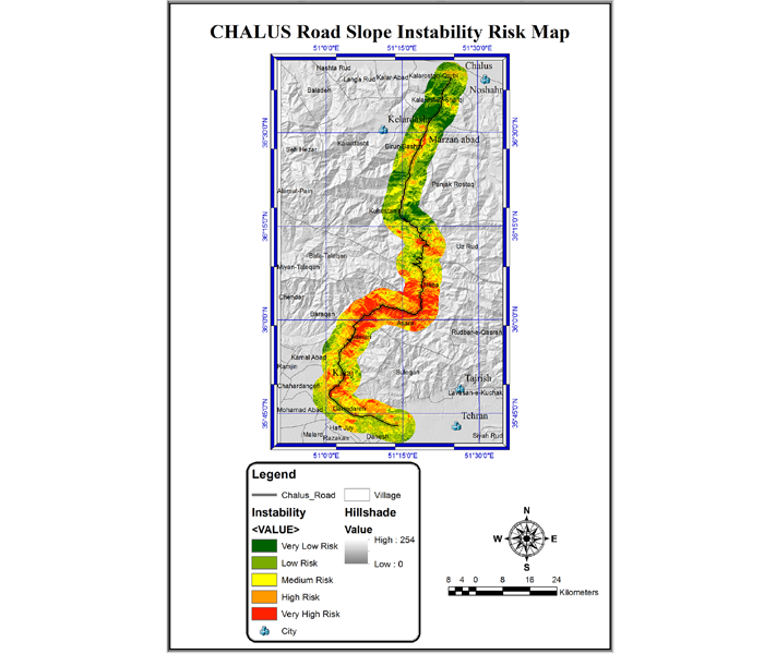 The landslide hazard map prepared for the present study road (fig. 8), has revealed that the northern part of the rout falls under very low to low risk except near the Marzan Abad city because of the KalarDasht heights. Increasing vegetation density is one of the reasons for reducing the risk in the northern part of the rout. Very high risk zones are mainly concentrated between Aderan and Nesa cities that explained by the presence of steep slopes and the effect of the faults which affected this section of rout. In this section and of course other sections, those hillside that facing to the west have a more chance in instability because of lack of sunlight. There is a significant risk reducing by getting away from the road, which indicates a decrease of manmade activities. In general, most of the areas on this rout are zones that have the medium to high instability. Due to the high traffic, especially on vacations, and mountainous cold weather conditions, to prevent the landslide risks, the essential measures are necessary to considered.