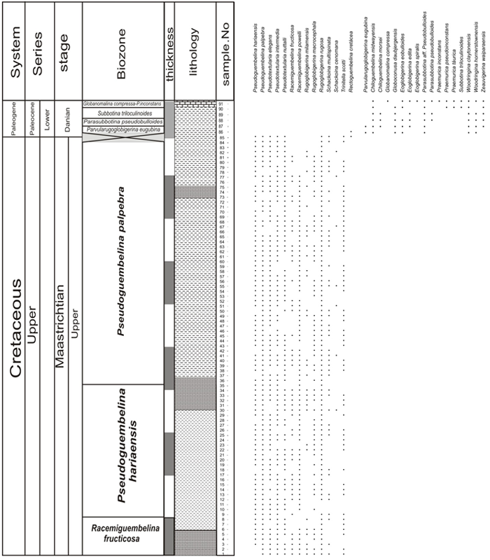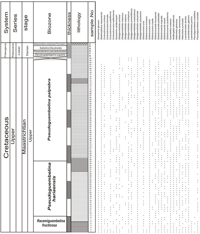This zone characterized by the firstappearance of Pseudoguembelina hariaensis at the base and the HO (Highest occurrence) of Gansserina gansseri at the top (Li and Keller, 1998a ) This biozone spans about 1.4 My (66.8-65.45 Ma) that showing late-Maastrichtian stage (Li and Keller, 1998a ). This zone spans 66 m of brown marl and limy marl. The dominant species in this zone are Gansserina gansseri, Globotruncana aegyptiaca, Globotruncana arca, Globotruncanella havanensis, Globotruncanella petaloidea, Planoglobulina carseyae, Planoglobulina riograndensis, Pseudoguembelina costulata, Pseudoguembelina excolata, Pseudoguembelina palpebra, Pseudotextularia elegans, Pseudotextularia intermedia, Rugoglobigerina rugosa, Trinitella Scotti, Racemiguembelina powelli, Heterohelix globoulos and Laeviheterohelix glabrans (Figures 2 and 3; Plates 1-4). This biozone is placed in the middle of Late-Maastrichtian by Li and Keller (1998a ).