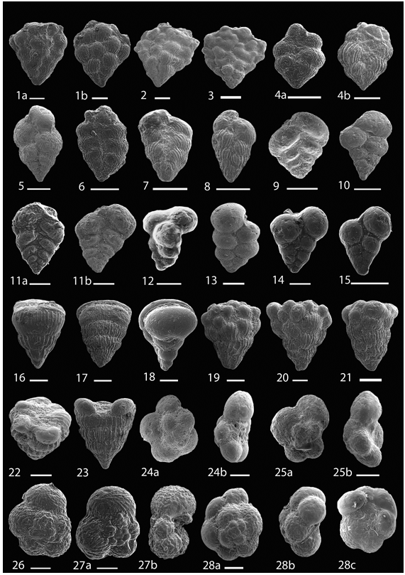 Planoglobulina brazoensis; 2-Planoglobulina acervulinoides; 3- Planoglobulina manuelensis; 4- Pseudoguembelina palpebra; 5, 6- Pseudoguembelina hariaensis; 7- Pseudoguembelina costellifera; 8- Pseudoguembelina costulata; 9- Laeviheterohelix pulchra; 10-Laeviheterohelix glabrans; 11a,b- Laeviheterohelix dentata; 12- Guembilitria cretacea; 13- Heterohelix punctulata; 14-Heterohelix globulosa; 15- Heterohelix navarroensis; 16, 17- Pseudotextularia elegans; 18-Pseudotextularia nuttalli; 19,20-Racemiguembelina fructicosa; 21,22- Racemiguembelina powelli; 23- Pseudotextularia intermedia; 24a, b- Globotruncanella havanensis; 25a, b- Globotruncanella petaloidea; 26- Rugoglobigerina rugosa; 27a,b- Rugoglobigerina macrocephala; 28a,b,c: Rugoglobigerina milamensis.