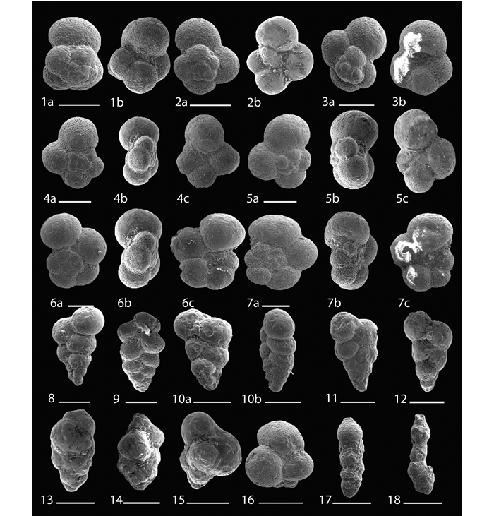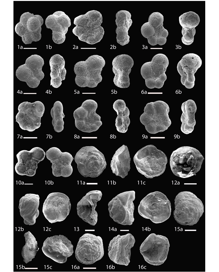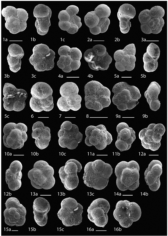 1a, b-Globigerinelloides multispinus; 2a, b- Globigerinelloides impensus; 3a, b- Globigerinelloides alvarezi; 4a, b: Globigerinelloides subcarinata; 5a, b- Globigerinelloides asperus; 6a, b: Globigerinelloides prairiehillensis; 7a, b: Globigerinelloides rosebudensis; 8a, b-Globigerinelloides yaucoensis; 9a, 9b-Globigerinelloides rosebudensis; 10a, b- Hedbergella holmdelensis; 11a, b, c: Contusotruncana patelliformis; 12a,b,c- Contusotruncana contusa; 13,14- Contusotruncana contusa; 15a,b,c- Contusotruncana sp. 16a,b,c: Contusotruncana walfischensis.