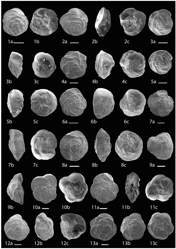 1a,b,c- Globotruncanita stuarti; 2a,b,c- Globotruncanita stuartiformis; 3a,b,c- Globotruncanita stuartiformis; 4a,b,c-Gansserina wiedenmayeri; 5a,b,c- Gansserina gansseri ; 6a,b,c- Gansserina gansseri; 7a,b,c- Abathomphalus mayaroensis; 8a,b- Trinitella scotti; 9a, b- Schackoina multispinata; 10- Schackoina cenomana.