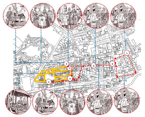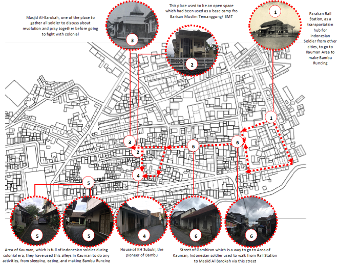 Figure 4 shows some important places that were visited and stayed in by the warriors in the colonial era, while they were making Bambu Runcing and asking for blessings and prayers from all the Kyai in Kauman Area. They used public spaces to stay and live in, particularly the alleys. All the activities of the warriors, who were also called “instant” immigrants from other cities in Indonesia, took place within the alleys of Kauman Area. They made Bambu Runcing in the area, they slept on the streets within the alleys, and they waited for blessings and prayers from KH Subuki.