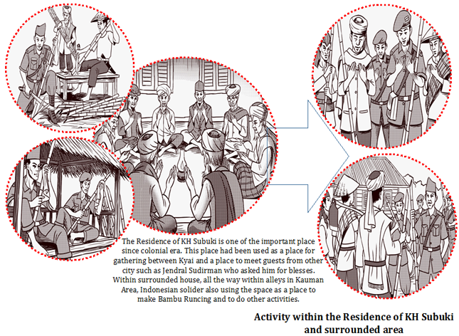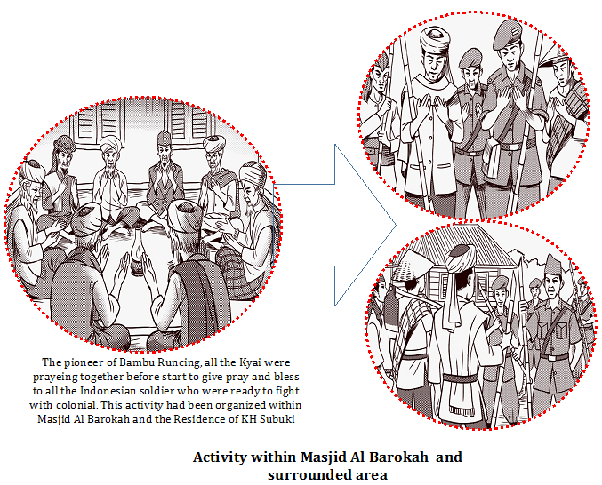 Figures 5, 6 and 7 show the activities of the warriors and local community, who were incorporated in Barisan Muslim Temanggung or Barisan Bambu Runcing within Kauman Area. Figure 5 shows how the warriors worked together with the local community (farmers, Muslim students and civilians) in making Bambu Runcing as a traditional weapon to fight the colonialists (Dutch and Japanese). It also shows how the warriors made the Bambu Runcing and prepared it for battle, while Figure 5 shows that the location of these activities was in the alleys within Kauman Area. Figure 6 shows the activitiy of all the Kyai of Bambu Runcing who prayed for the warriors before they went to fight the Dutch and Japanese. This activity was described in the Masjid Al Barokah, which is known as Masjid Bambu Runcing nowadays. The last depiction, as shown in Figure 7 , is of the activities of all the Kyai and Indonesian warriors in the residence of KH Subuki and the areas nearby. They prayed before going into battle. All the activities shown in Figures 5, 6 and 7 can be incorporated into one Figure, 1.E Figure 8.