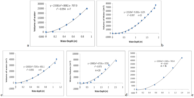 Figure-4. Hydro-hypsometric curves showing non-linear relationships between water depths and volumes for Makoye reservoir at: low capacity (20/8/2015) (a); full capacity (3/3/2016) (b); medium capacity (19/6/2016) (c); full capacity (17/02/2017) (d) and; medium capacity (14/7/2017) (e).