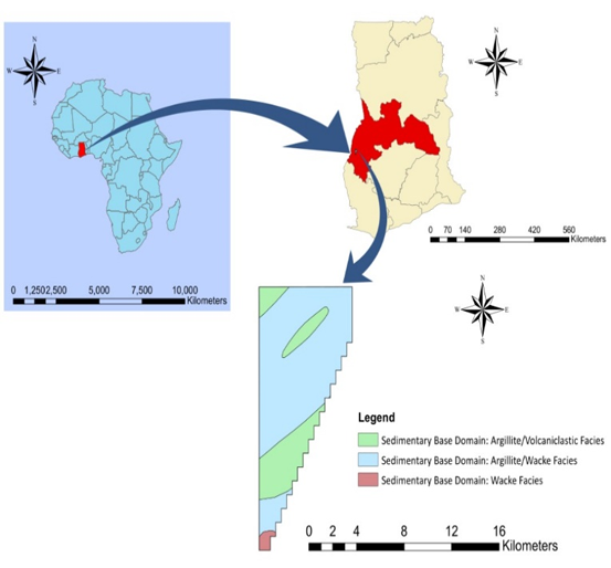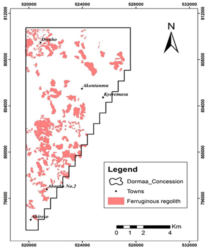 The study area is located at Dormaa Ahenkro approximately 400 km northwest of Sunyani, the capital of Brong Region, Ghana Figure 1. The study area is within the Suyani sedimentary basin bounded to the southeast by the Paleoproterozoic Sefwi gold Belt and to the northwest by the Bui Belt Torkornoo (2017). The concession is approximately 86.44 sqkm2. At its narrowest point, the Basin is 65 km wide, but broadens considerably to the south near Sunyani. The Sunyani Basin is predominantly underlain by thick sediments of north-east trending Birimian metasedimentary rocks intruded predominantly by biotite rich-granites (Kesse, 1985; Leube et al., 1990; Dzigbodi-Adjimah, 1993). Belt type granitic plutons also occur centrally and to the southeast of the concession (Kesse, 1985; Leube et al., 1990; Dzigbodi-Adjimah, 1993). The sedimentary basin rocks common on the property are argillites, and wackes facies but also includes minor chert and few volcanoclasitic rocks (Griffis et al., 2002). The geomorphological setup of the project area falls within the forest-dissected plateau with only few areas turned into secondary forest and shrubs (Dickson and Benneh, 1995). The terrain is fairly flat with broad hills and gentle slopes with elevations ranging from 270 to 360 metres above mean sea level. The climate of the area is of wet-semi equatorial type (Dickson and Benneh, 1995) with relatively abundant of rainfall ranging from about 1250 mm to about 2,100 mm, which is in tandem with the annual rainfall range in Ghana (MEST, 2012). The total evaporation is approximated to 1350 mm (Dickson and Benneh, 1995). According to Butt and Zeegers (1992); Freyssinet et al. (2005); Arhin et al. (2015) distinct climatic changes occurring over a long period of time facilitates lateralization processes that forms laterites.