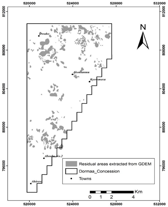 The remotely sensed dataset including GDEM, ASTER Level IT were all obtained from the USGS site. The radiometric data was also obtained from the Ghana Geological Survey Authority. These images were pre-processed prior to their usage. For example, the images were geometrically corrected and georeferenced to the WGS-84 datum and UTM zone 30N coordinate system. The 90m resolution GDEM image was first processed in ArcGIS 10.3 during which the fill algorithm was used to remove all small imperfections in the data. It was then imported into global mapper for regolith information to be extracted.