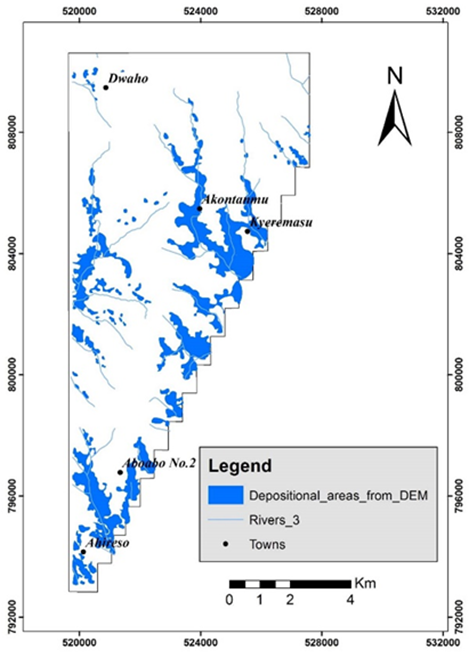 In Figure 11, 46% of the study area is overlain by ferruinous regolith, which the environments of formation could be either residual or transported. Gold geochemical expressions in this regolith regime may be subdued and erratic or subdued and subtle in such away that anomaly detection may be challenging without proper understanding of the regolith environment. 24% of the entire landscape were also covered by depositional regolith. This regime had similar influence on metal ion migration beause of the uneven ditributions due to the surface processes that moved sediments and minerals around Figure 12. The dopositional regime also have the tendency to obscure mineral anomaly when it overlays a preexisting preserved surface (Cohen et al., 2010). Both ferruginous and depositional regimes covered close to 70% of the entire area and have capabilities impacting negatively on gold transport in the surficial environment. Again, regolith materials from both ferruginous and depositional have the tendency to either enhance or dilute the mineral concentration, distort geochemical dispersion of Au. This interpretation is in line with Arhin et al. (2015); McQueen (2004) and Cohen et al. (2010) position that gold poor sediments dilute gold signatures in preserved and pre-existing surfaces whilst Fe-oxide, pisoliths and clay minerals generally encrust the detrital gold grains thereby subduing the gold expressions in sample.