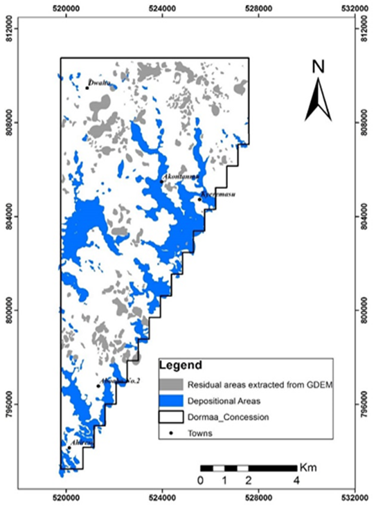 The spatial distribution of the identified regolith materials extracted from the remotely sensed images during the landform mapping have been outlined below. The residual and depositional regolith regimes extracted from the GDEM are shown in Figure 2 and Figure 3 respectively. The extracted classes from the GDEM were unable to distinguish the residual materials with little or no drift from the data. Similarly, the proximal and distal sediments were indistinguishable from the image interpretations. This was noted by Tapley (2002) and Arhin et al. (2015) when they indicated that no single remote sensing image processing and interpretation can wholly define all the regolith regimes. The first RLU map made up of both the extracted residual and depositional units were presented in Figure 4.