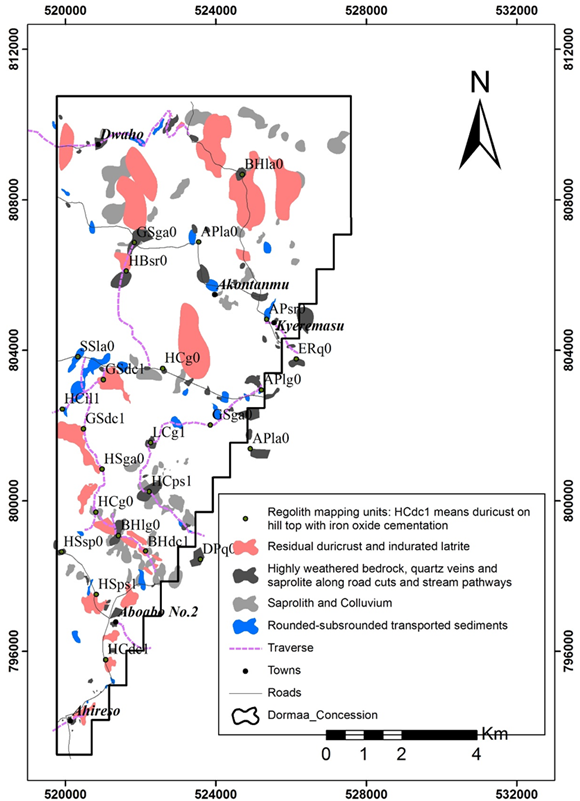 Field exercise was embarked on at a scale of 1:50m. Cut grid lines, road cuts, footpaths and trails were used as traverse lines along which the already identified units on the RLU map were ground verified. In addition, exposed regolith landform units that were not captured on the RLU map were also mapped. Pits were dug at some locations to decipher the depth of covered materials and each landscape location was recorded by GPS. At every landscape location, observations were made on the mapping units and its immediate surroundings. Identification clues such as soil texture, type of cementing matrix, texture of other weathered materials, sphericity of quartz pebbles, rock fragments, indurations, outcrops, truncated exposures, grain composition and nature of topography were used to identify the regolith type (Cohen et al., 2010; Arhin, 2013). Along these traverse lines surface materials that bear relationship to the underlying substrate and contain large amounts of angular to sub angular lithic units were mapped and considered residual regolith. Areas where preserved existing lateritic profiles were found to be concealed predominantly by rounded to sub-rounded lithic and quartz fragments and sediments from diverse sources were ascertained by pits and mapped as depositional. Terrains within which varying degrees of truncation of the lateritic profile has occurred and patches of saprolite and clay zones exposed at surface were mapped as erosional. This includes outcrops and exposures. Finally, areas characterised by the occurrence of lateritic residuum at or close to surface. In situ soils and soils with insignificant lateral movements were included in this regime. This regolith domain represents an ancient weathered surface but the grouping was based on factual observation during the field ground truth mapping (Cohen et al., 2010; Arhin et al., 2015). These environments were mapped and added to the regolith and landform data. The Feoxide- rich landscapes, lateritic, duricrusts, lateritic gravels were all mapped to be part of the ferruginous regime.