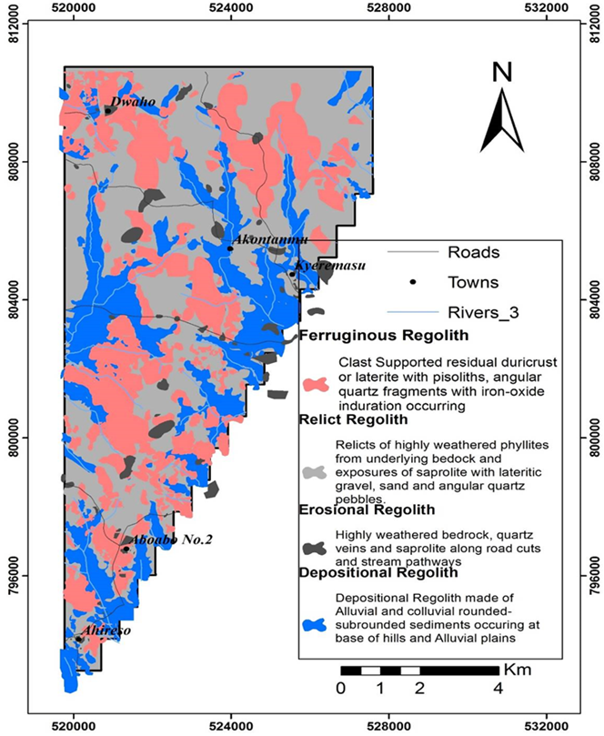 The observable features mapped on the field were compiled and grouped based on regolith mapping similarities and classified to represent a specific regolith regime (Arhin, 2013; Arhin et al., 2015). The different regolith types were digitized and coded with a unique colour on a GIS environment. This led to the production of a factual map of the area. The factual map was superimposed on the existing RLU map. The superposition, however, authenticated the landscape classification map and all possible fraught associated with landform misinterpretation were resolved. The final regolith grouped the regolith mapping units into Ferruginous, Relict, Erosional and Depositional.