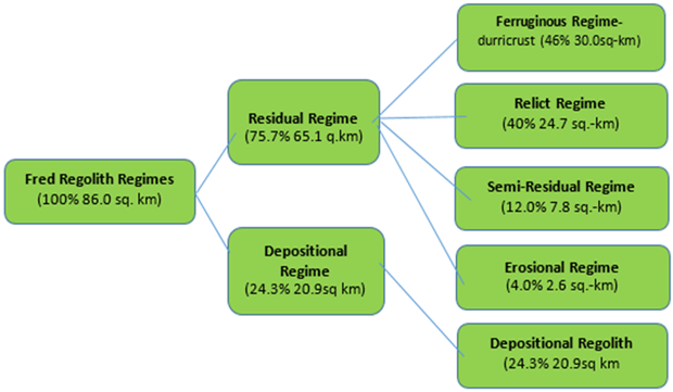 The final regolith map which integrated the RLU and factual map was presented in Figure 10. The spatial distribution and extent of the regimes were also presented in Figure 11. The mosaic of different regolith units coexisting in the same geochemical terrain for anomaly detection required proper distinctions of the individual units in order to properly analyze and interpret the geochemical results obtained from the soil survey. Anything other than incorporating the regolith in the gold geochemical interpretation will lead to data interpretation challenges.