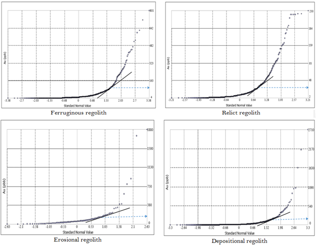 Figure-12. Probability Q-Q plots of the four regolith types showing the estimated threshold values.