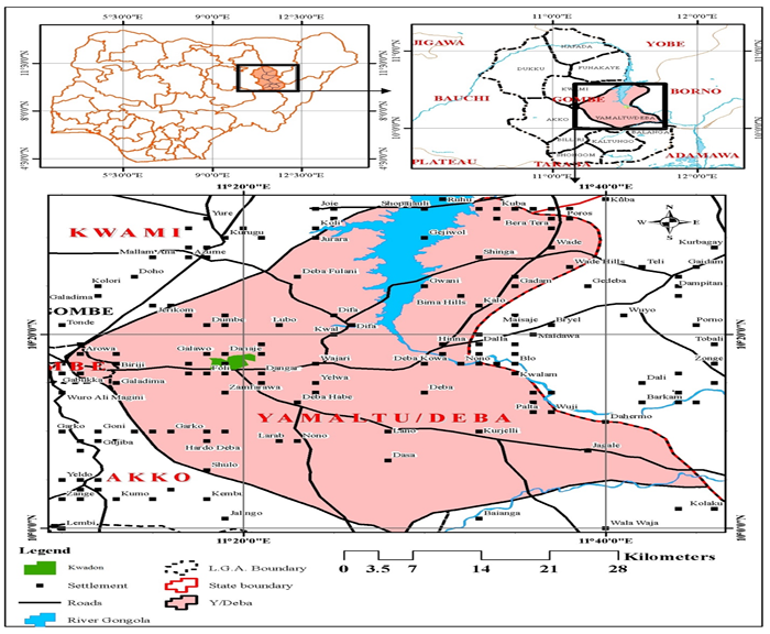 Kwadon district is an area within Yamaltu Deba Local Government Area of Gombe state. It lies between 10°00¹, 10°30¹ and on 11°11¹E to 11°45E respectively. The study area is located about 7km away from the State Capital, along Gombe-Biu road Figure 1. The area under study is part of extreme tropical continental type of climate. One of the basic characteristics of this climatic zone is its relative short rainy season and the comparatively long dry season. The beginning and the end of the rainy season changes from year to year. It usually begins in late April to early may and ends in late September or early October. The area has a rainfall distribution ranging from 970.7mm – 1.142mm annually, with a mean of 850mm and a mean maximum and mean minimum temperature of 32.8°C and 18.3°C respectively.