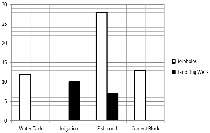 Figure 2 and 3 shows the number and spatial distribution of water sources in the study area. The study revealed two major sources were identified and these are wells and boreholes. From Table 3 boreholes constitute 60% of the water sources while wells constitute 40%. The main implication of this finding is that boreholes abstract high volume of water from the underground surface than wells. This is because boreholes provides most of domestic water demands to Gombe metropolis such areas as Tumfure, Federal College of Education, Gombe State University, Federal Low cost. The wells on the other hand are used for the fish ponds and irrigation. This finding revealed that there is significantly high abstraction of underground water leading to lowering of the water table level and thus negative future implication of water availability.
