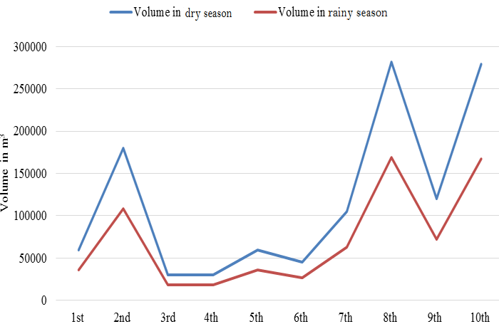 Figure-11. Mean volume of water abstraction between dry and rainy season for irrigation farming.