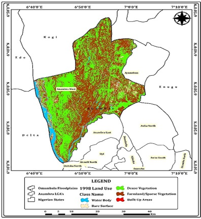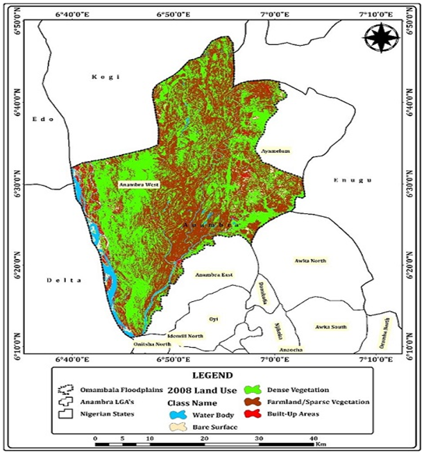 This study area encompasses three contiguous local government areas of Anambra East, Anambra West and Ayamelum. Geographically, it is located between latitude 60 401011 N and latitude 60501011 Nand longitude 60401011 and longitude 7051011 Figure 1. It has an estimated land area of 1376.49 km2.