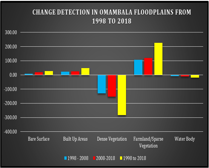 Similarly, between 2008 and 2018, Areas covered by bare surface continued to increase within the floodplain such that by 2018 it occupied about 89.4km2 constituting 11.5% of the entire floodplain. Built-up area is seen to have maintained a steady increase in land area from the previous record of 30.8km2 in 1998, to 56.1km2 in 2018, equivalent to 4.7% of the land area. On the contrary, dense vegetation declined in size. By 2008, the area was 460 km2 but in 2018, it has reduced to 306.2km2 (20.2%). In all, dense vegetation cover lost about 154km2 in a decade. Farmland/sparse vegetation maintained a steady increase in land area within the floodplain. By 2018, the land area increased to 878.1km2 (61%) from the previous record of 758.8km2 in 1998. On the contrary, Waterbody declined in its size such that by 2018 it had lost about 45.7km2(2.5%) to other land uses/covers, amounting to loss of (10.3%) its previous size see Table 3.