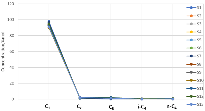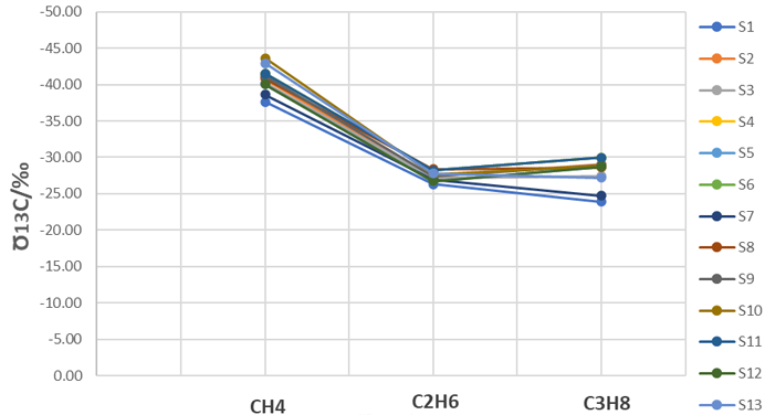 Thirteen (13) natural gas samples were collected from 13 producing gas wells in the “X” field of the Niger Delta using isotubes. Through opening pressure check, the integrity of the samples was confirmed. The gas samples, heated to their sampling point temperatures were analysed by the Gas chromatographic technique for their molecular composition, using GPA 2286 as a standard test method. Individual hydrocarbon gas components from methane to pentanes (C1-C5) were separated using a capillary column (Plot Al2O3 50 m x 0.53 mm). The GC oven temperature was initially set at 30 0C for 10 min and then elevated to the maximum temperature of 180 0C at a rate of 10 0C/min where it was held for 20-30 min. In accordance with ASTMD 4810, Gastec tubes were used to measure the hydrogen sulphide contents of the samples. The carbon isotopic compositions were computed using the regression formulas by Faber (1987) . The analytical results were subjected to data treatment and interpretation.