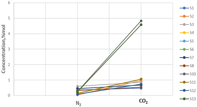 The cross-plot of iC4/nC4 against C2/C3 indicated in Figure 6 also corroborates the findings in Figure 5. According to James (1983) a comparison of carbon isotope (C1-C4) data from the individual gas components is an important tool in gas-to-gas correlations. The plot of carbon isotopic data from the 13 natural gas samples as indicated in Figure 7, shows similar patterns for 11 samples except for S1 and S7. The similarities in patterns for the 11 samples denotes that they are genetically related. This further confirms the initial findings that all the natural gases from the “X” Field of the Niger Delta are genetically related and can be classified into one genetic family. This denotes that the natural gases were generated by the same source rock. Samples S1 and S7 have molecular and isotopic compositions very different from the rest of the samples, this may be attributed to the presence of an impermeable layer within the reservoir preventing fluid communication between wells S1, S7 and the rest of the wells within the “X” Field. Dembicki-Jr (2017) indicated that the non-hydrocarbon gases ( CO2, N2, H2S) can be useful in gas-to-gas correlation. The plot of the concentration of the non-hydrocarbon gases in Figure 8 showed dissimilar patterns for all the samples. The absence of H2S may impede the use of the non-hydrocarbon gases in this study.