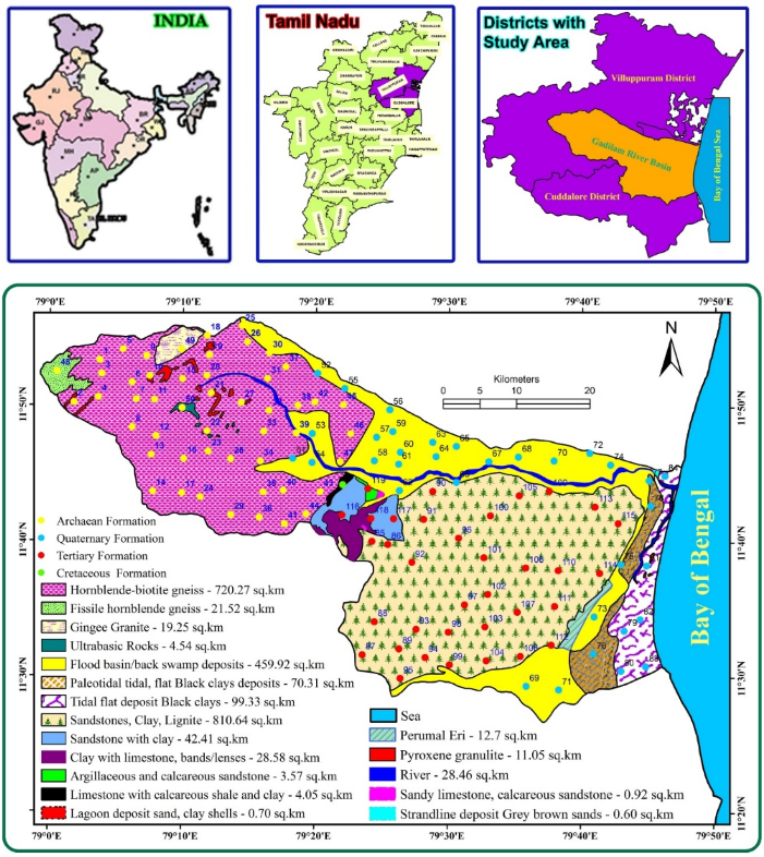 The Gadilam River base border was defined using Survey of India topographical maps 58I/13, 58M/1, 58M/2, 58M/5, 58M/6, 58M/7, 58M/9, 58M/10, 58M/11, and 58M/15 on a 1:50,000 scale, as well as drainage updates in current satellite data. Landsat-8 TM data is used to create a spatial map of land use and land cover (March-2018). The geology map is derived from the district resources map. The upper basin of the Gadilam River reveals Archaean formation, while the lower basin displays Tertiary uplands in the south and recent alluvium (Quaternary) in the north Figure 1.