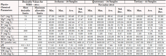Table 1 displays the Archaean, Quaternary, and Tertiary formation lowest, maximum, average, and standard deviation values of physio-chemical parameters during November 2018 findings. During this season, the concentrations of Calcium (Ca2+), Magnesium (Mg2+), Nitrate (NO32-), Fluoride (F-), Sulphate (SO42-), Bi-carbonate (HCO3-), and Percentage of Hydrogen (pH) are all within the WHO 2011 limiting value.