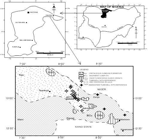 Daura town is situated in Daura Local Government Area of Katsina State in northern Nigeria. Daura is 80 km east of Katsina town near the border of Niger Republic, approximately centred on latitude 13o 06' N and longitude 08o 21' E (Figure 1). The sedimentary strata of Katsina-Daura area belong to the Cretaceous Gundumi Formation on the southeastern fringe of the lullemenden basin, referred to locally as the Sokoto basin. The Katsina-Daura sedimentary strata lies on the north-eastern part of the Sokoto basin and are bordered on the south by crystalline Basement Complex rocks and on the north by the Nigeria-Niger Republic borders (Figure 1).