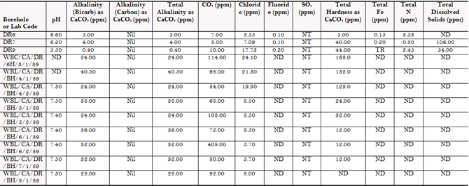 Table 4 shows the summary of the results of the groundwater chemistry in the study area. This summary includes chemical analysis of groundwater samples taken from boreholes DR6, DR7 and DR9; another set of results which did not indicate which sample was taken from which borehole.
