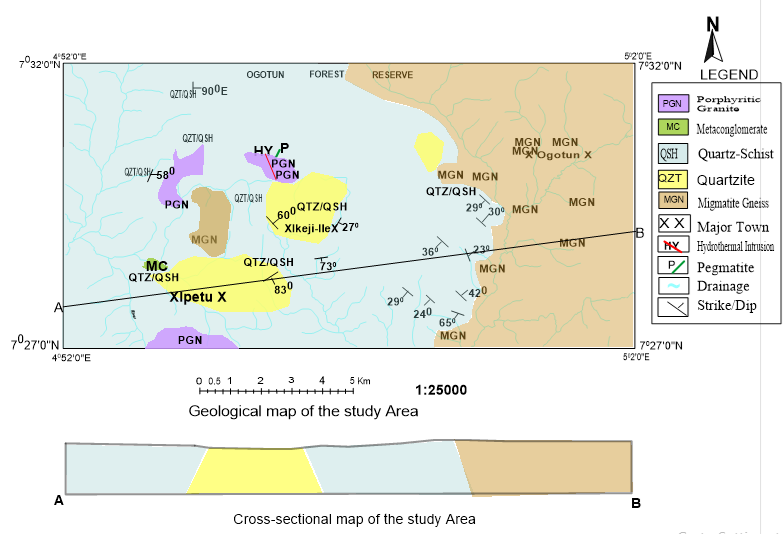 The geological map and cross section of the study area is presented in Figure 5. The map shows the dispositions of the rocks with well delineated boundaries. The cross-section confirmed folding in the study area which affected the quartzites and quartz-schists. The type of fold recognized is an antiform. Fifteen rock samples were collected from various locations within the study area Table 1.