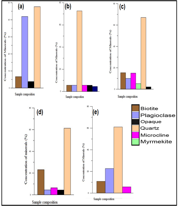 Figure 8. Histogram of percentage composition of the minerals in (a) migmatite gneiss along Okemi (2) Ogotun, (b) migmatite gneiss along Ikeji-Ile Ipetu, (c) schistose quartzite off Ikeji-Ile Road, Ipetu, (d) Metaconglomerate at Araromi Ipetu and (e) Sericoco Hotel, Ipetu